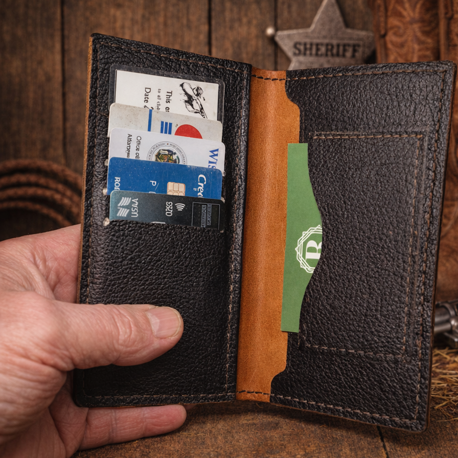 Handmade and stitched with full grain leather, the Brown "Minimalists" Wallet from RLR Leather LLC combines durability with refined simplicity. Designed to hold up to five cards, it features a convenient center pocket for cash or additional cards, making it both practical and sleek. Measuring approximately 2 3/4 inches by 4 inches, this wallet offers a compact yet spacious solution for everyday carry. Crafted with attention to quality and detail, it reflects RLR Leather’s commitment to producing premium leather goods that blend functionality with timeless style.